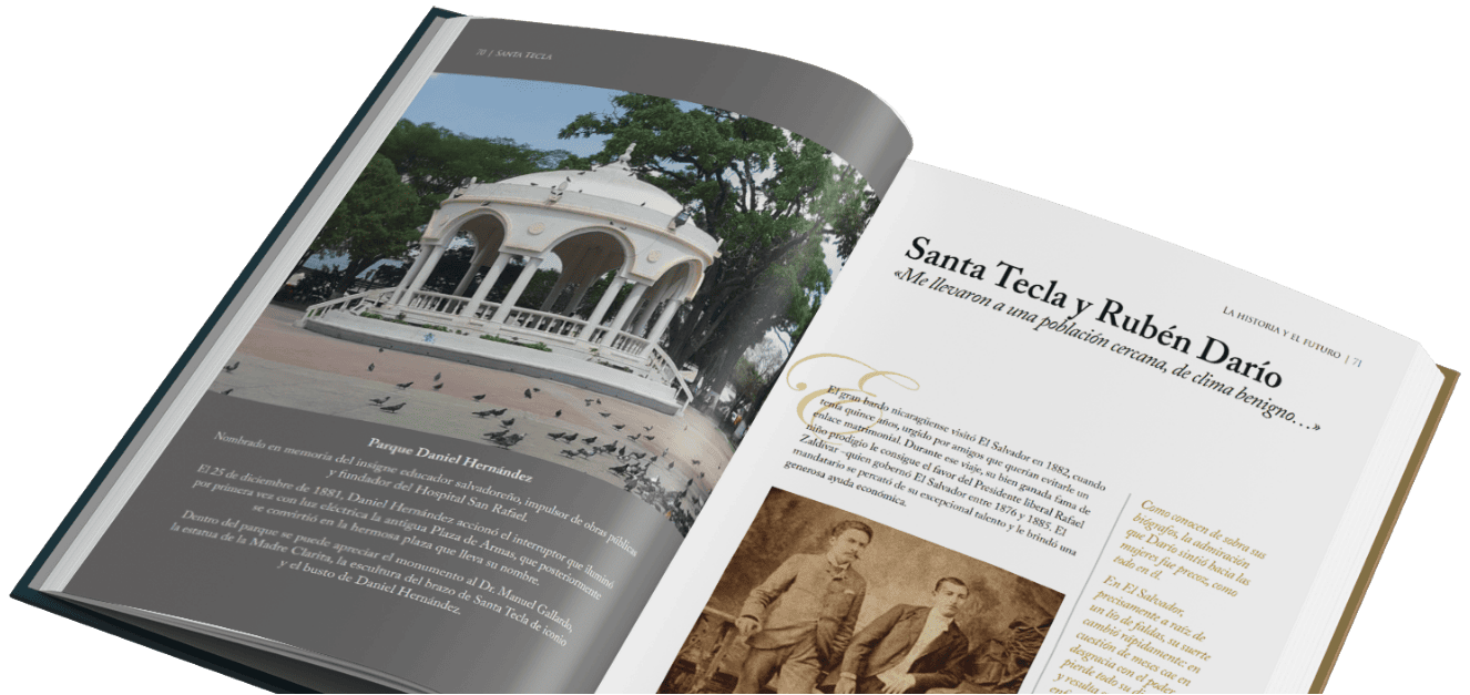 El libro comienza con la narración del terremoto que derribó San Salvador en 1854. El gobierno decidió trasladar la capital a una vasta llanura, cobijada de neblina, entre un volcán y una cordillera que relucían de verdor. Así nació Nueva San Salvador, ahora Santa Tecla. Nunca fue villa ni pueblo: fue creada para ser capital y protagonista de la era del café.